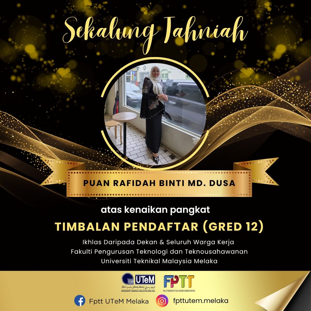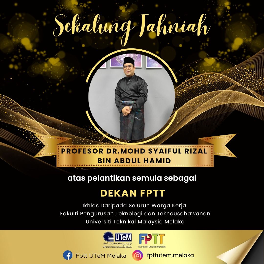 Fakulti Pengurusan Teknologi dan Teknousahawan (FPTT) merakamkan setinggi-tinggi tahniah kepada Prof. Syaiful Rizal atas lantikan semula sebagai Dekan FPTT, serta semua staf yang telah berjaya mendapat kenaikan pangkat pada tahun 2025 ini.