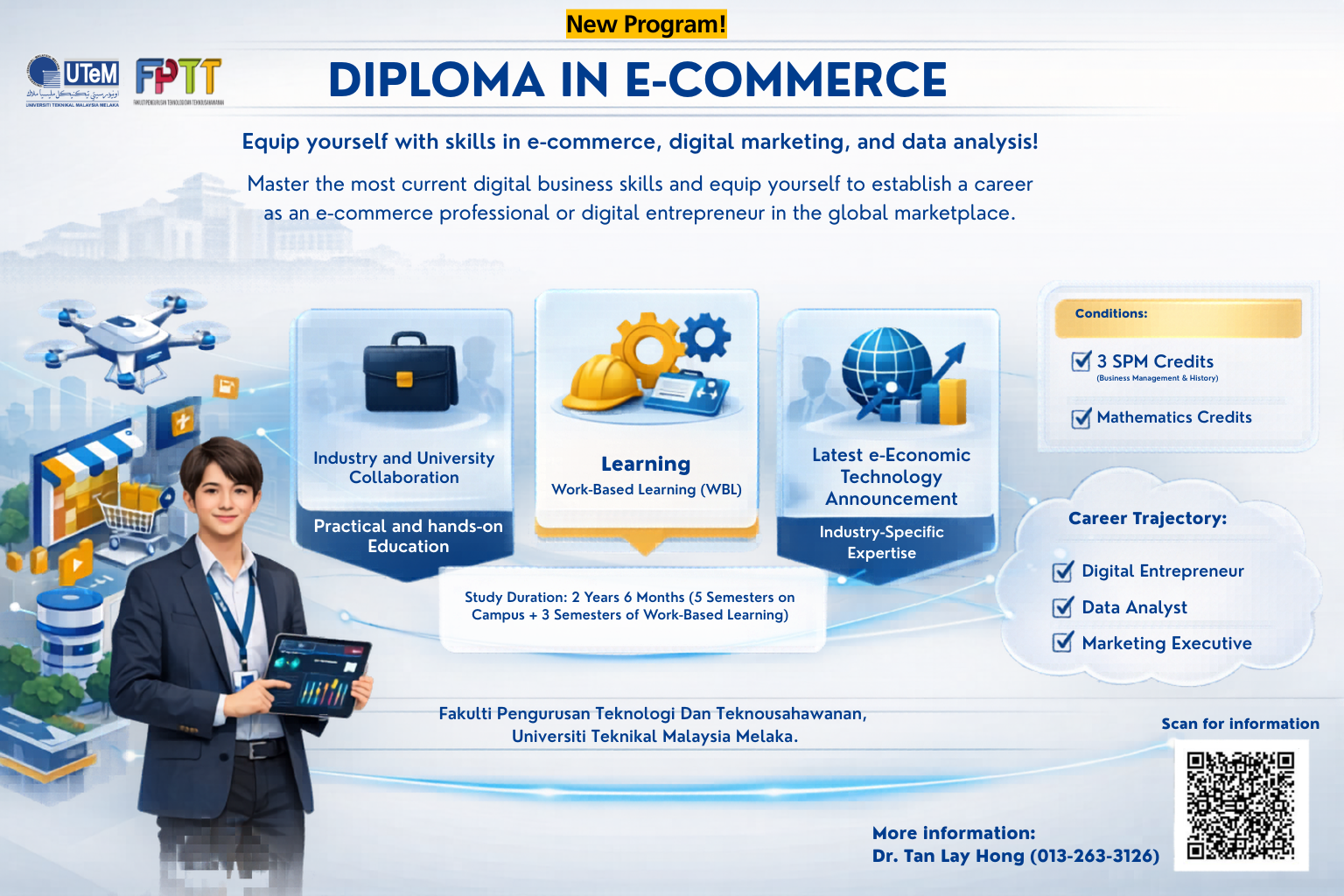 The Diploma in E-Commerce at Universiti Teknikal Malaysia Melaka (UTeM) is a programme designed to equip students with practical skills and industry-relevant knowledge in the digital business ecosystem. Built upon UTeM’s strength as a technical university with a strong TVET foundation, the programme emphasizes application-based learning and practical experiences aligned with the evolving demands of the digital economy.